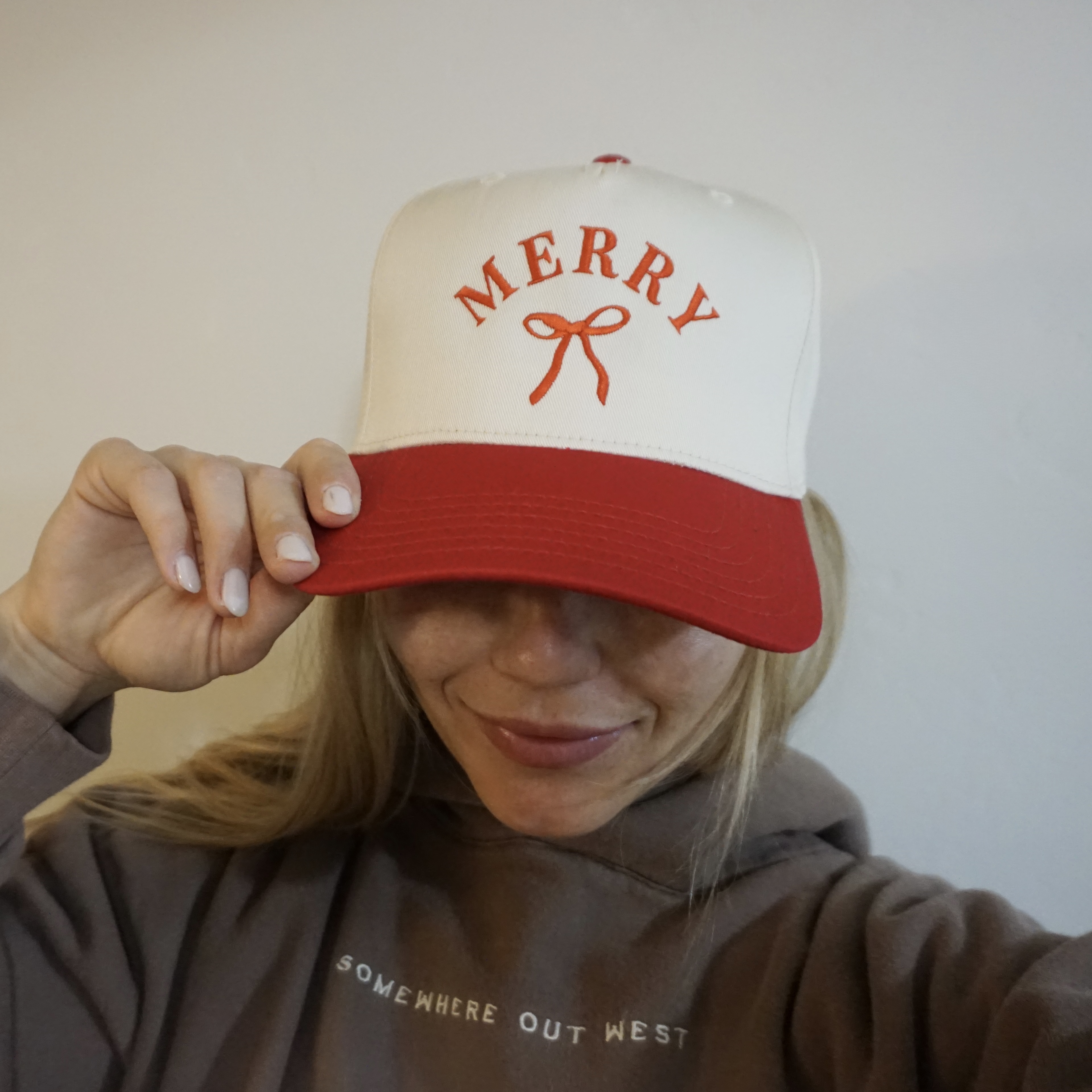 A cheerful holiday trucker with bright “MERRY” embroidery and a sweet bow detail. Cream crown, red bill, and an easy everyday fit — the perfect festive hat for the season.
